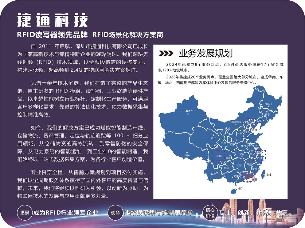 隨著人工智能與物聯(lián)網(wǎng)技術(shù)的深度融合,一場(chǎng)聚焦 “AI+IoT” 前沿進(jìn)展的行業(yè)盛會(huì)即將拉開帷幕。AGIC + IOTE 2025 第 24 屆國(guó)際物聯(lián)網(wǎng)展 - 深圳站,將于 2025 年 8 月 27-29 日在深圳國(guó)際會(huì)展中心(寶安新館)盛大舉辦。本次展會(huì)規(guī)模擴(kuò)大至 8 萬(wàn)平方米,預(yù)計(jì)將有超過(guò) 1000 家行業(yè)先鋒企業(yè)參與,集中展示在智慧城市、工業(yè) 4.0、智能家居等多個(gè)領(lǐng)域的創(chuàng)新成果。 作為國(guó)家高新技術(shù)、專精特新企業(yè),深圳市捷通科技有限公司已確定參展,誠(chéng)邀各界人士蒞臨交流! 關(guān)于捷通科技 深圳市捷通科技有限公司成立于 2011 年,專注于無(wú)線射頻(RFID)技術(shù)的研發(fā)與應(yīng)用,擁有 10 余年行業(yè)經(jīng)驗(yàn)。公司提供從低頻到超高頻以及 2.4G 全頻段的物聯(lián)網(wǎng)解決方案,自主研發(fā) RFID 模組、讀寫器、智能網(wǎng)關(guān)、工業(yè)終端等硬件,還能提供電子標(biāo)簽定制化生產(chǎn)及算法優(yōu)化服務(wù)。憑借專業(yè)的技術(shù)和服務(wù),已為智慧物流、資產(chǎn)管理、智能交通等 20