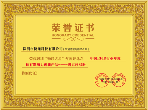 • 榮獲2018“物聯(lián)之星”年度評選中國RFID行業(yè)年度最有影響力創(chuàng)新產(chǎn)品