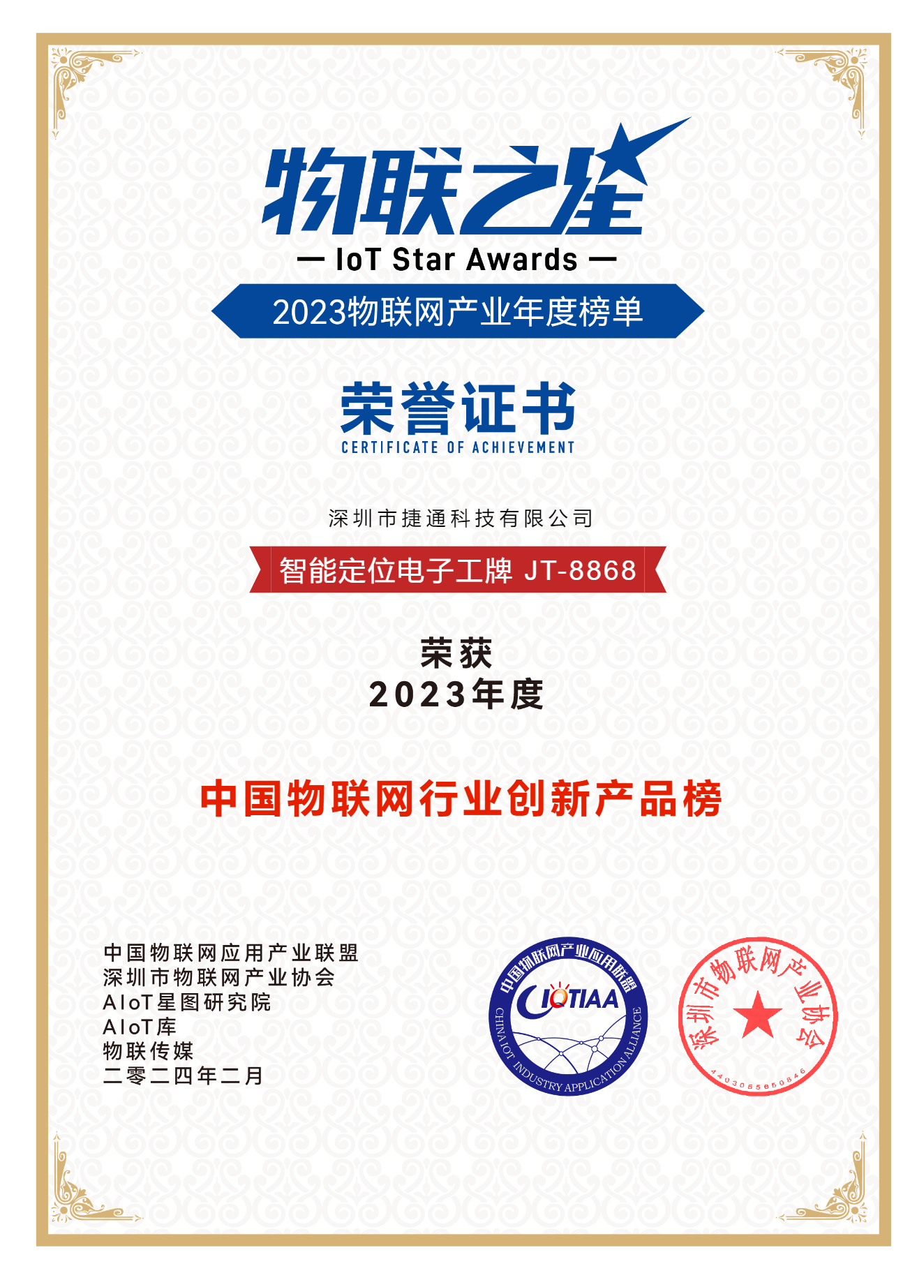 • ”物聯(lián)之星“2024物聯(lián)網(wǎng)產(chǎn)業(yè)年度榜單榮譽證書